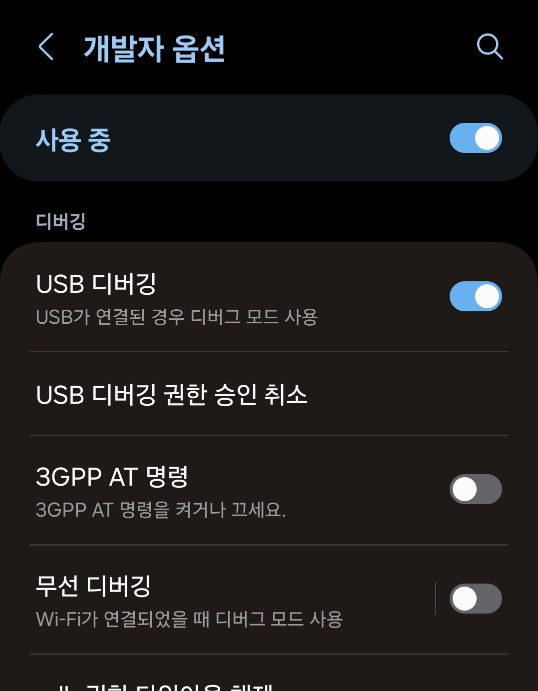 여기서 USB 디버깅이 유선 연결을 할때 켜줘야하는 설정이고, 우리가 할 것은 무선 디버깅입니다.