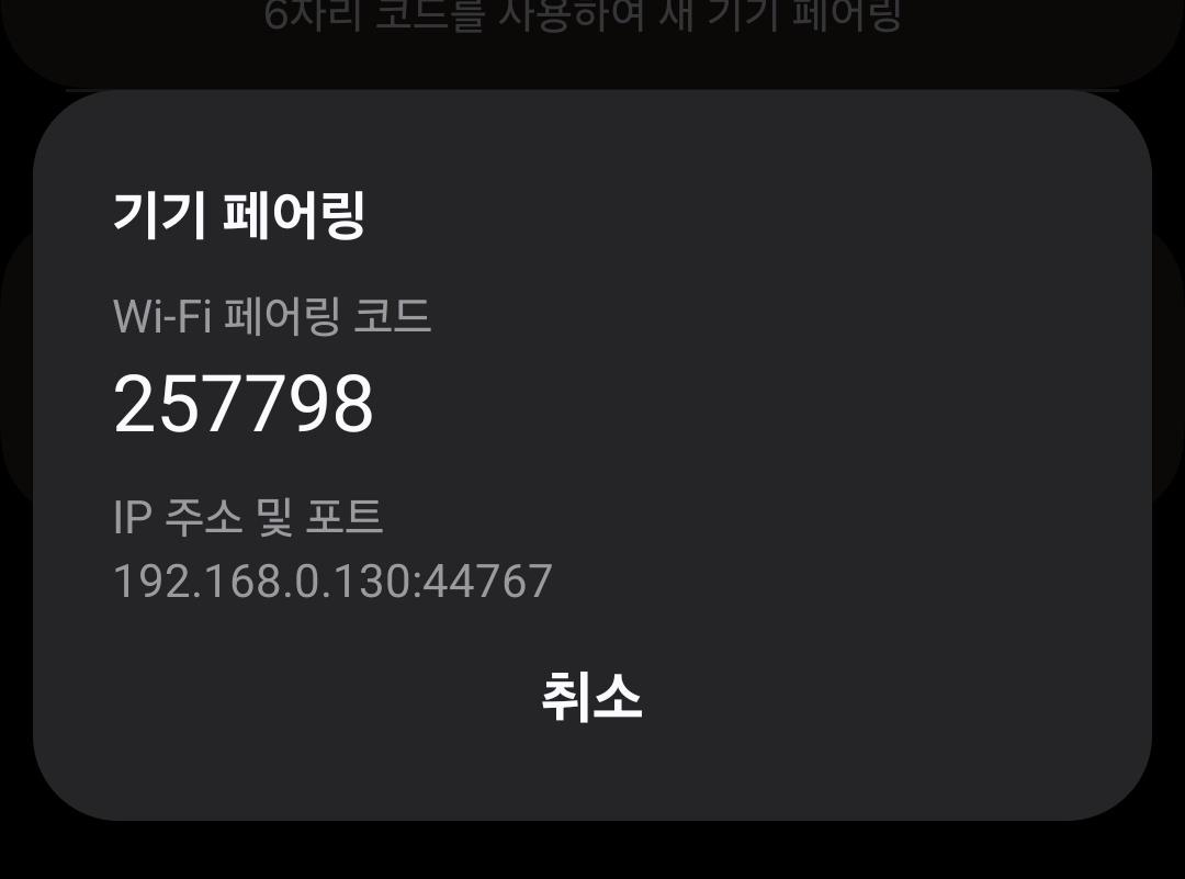 페어링 코드로 기기 페어링을 누르면 임시 페어링 정보가 뜹니다. 터미널에 오른쪽 ip:port 를 입력합니다.