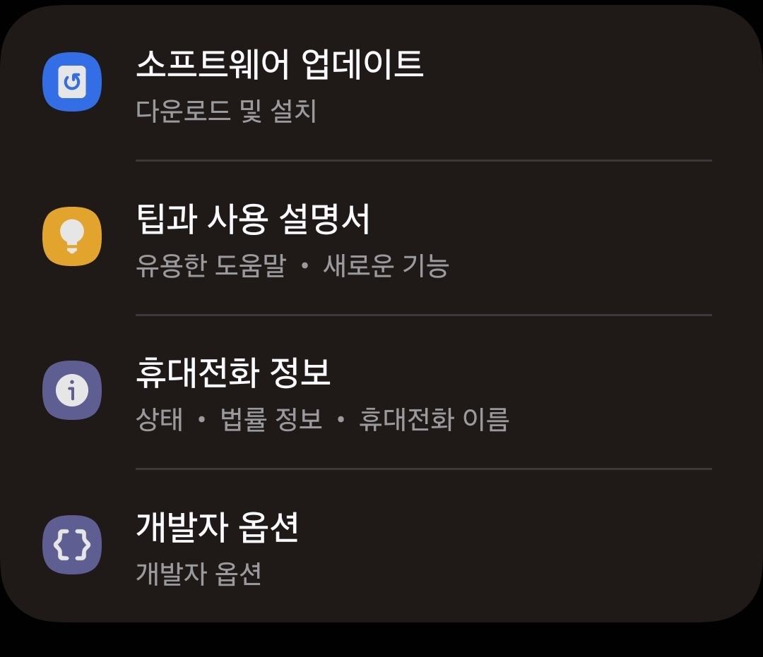 설정 > 휴대전화 정보 > 소프트웨어 정보 > 빌드번호 로 가서 빌드번호를 7번 탭하면, 숨겨져 있던 "개발자 옵션" 항목이 생깁니다.